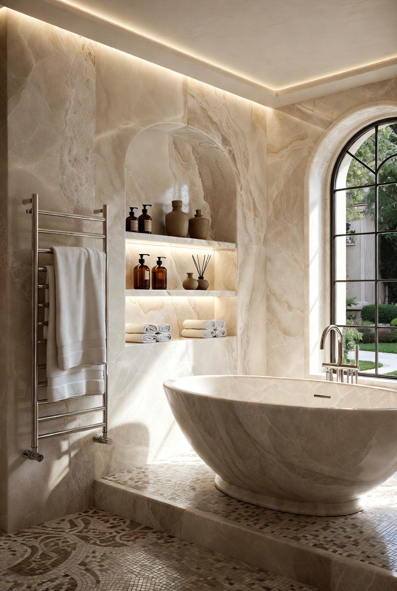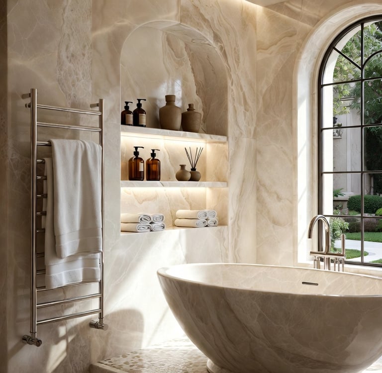 Hidden Storage Niches: Carved directly into the shower wall to eliminate "clutter" from bottles.