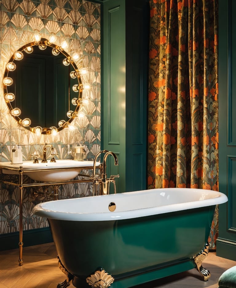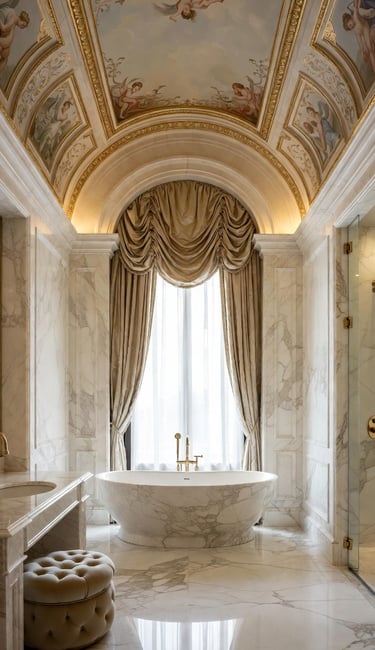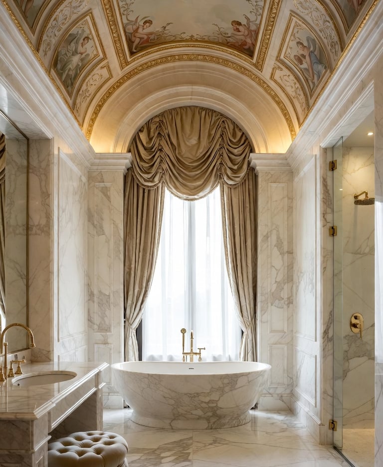 Floor-to-Ceiling Linen Curtains: To soften the hard surfaces of the bathroom.