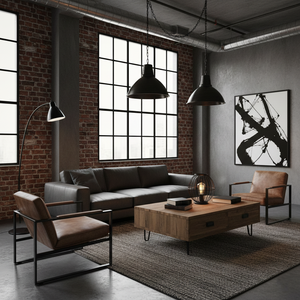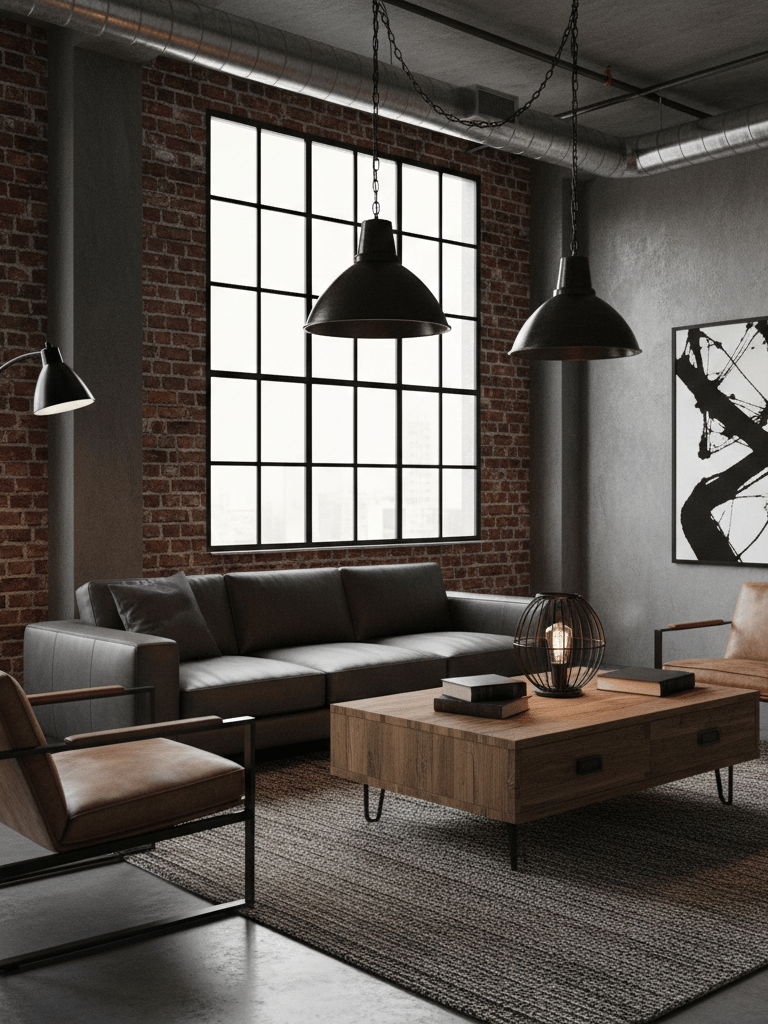 Industrial living rooms embrace raw textures and bold design elements. Exposed brick, metal accents, and neutral or moody color palettes define this style. Clean lines mixed with rugged finishes create a space that feels modern, edgy, and stylish. Soft furnishings and warm lighting help balance the rough elements, making the room both striking and comfortable.