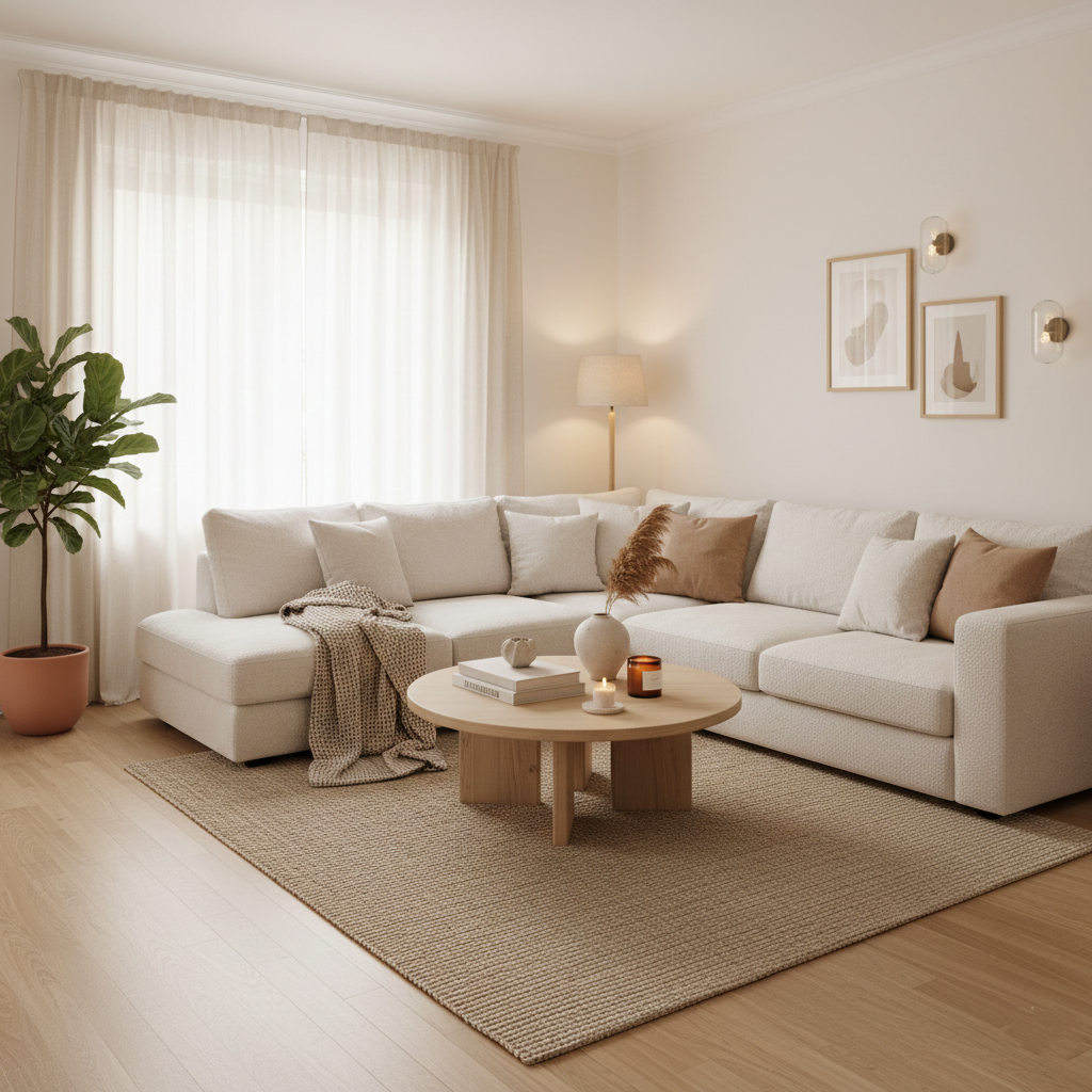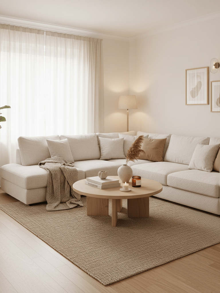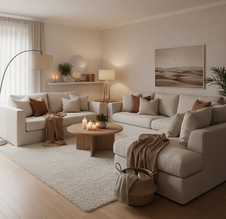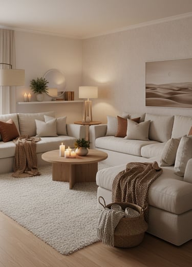 A cozy living room focuses on comfort and warmth. Layer soft textures like throws, cushions, and rugs to create an inviting atmosphere. Warm lighting, candles, and natural materials help soften modern interiors and make the space feel lived-in.