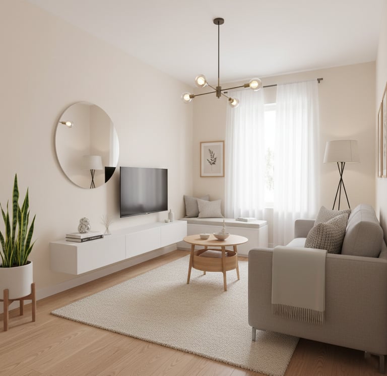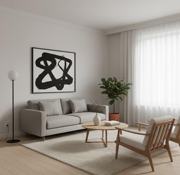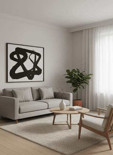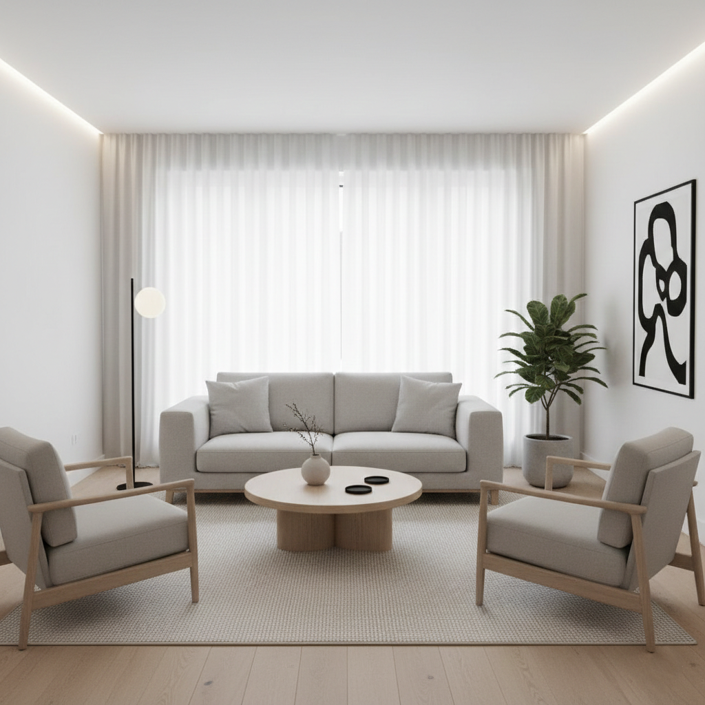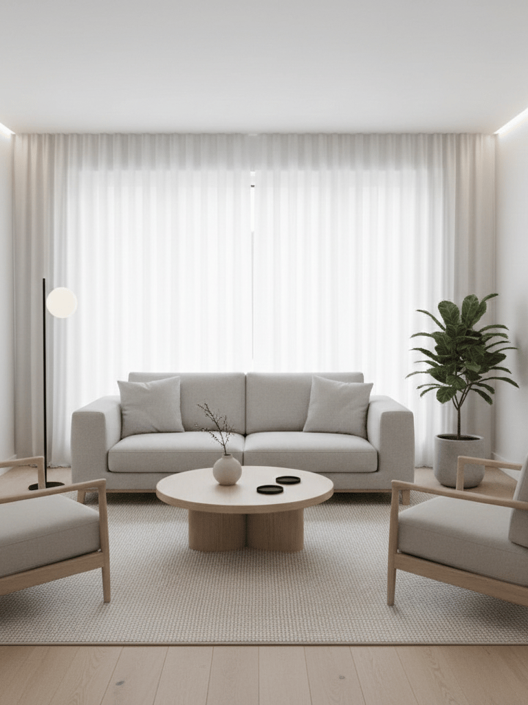 Decorate with a few meaningful accents—art, plants, or sculptural objects—to maintain visual interest without clutter. This approach creates a peaceful, modern living room that feels light and balanced.