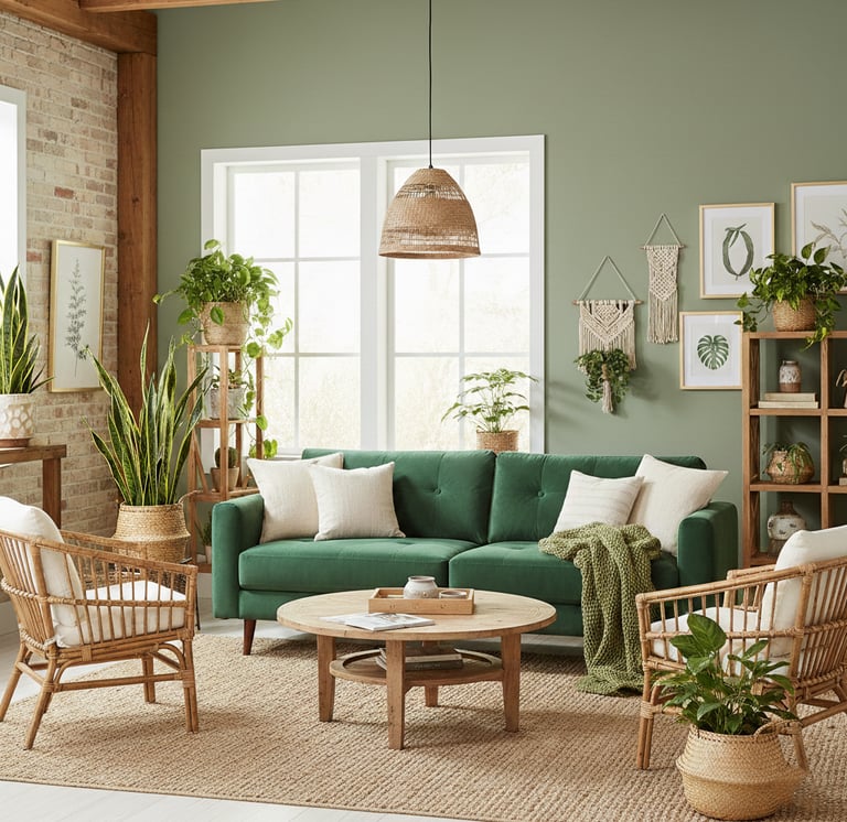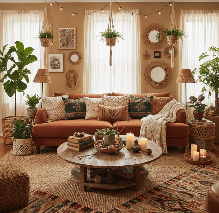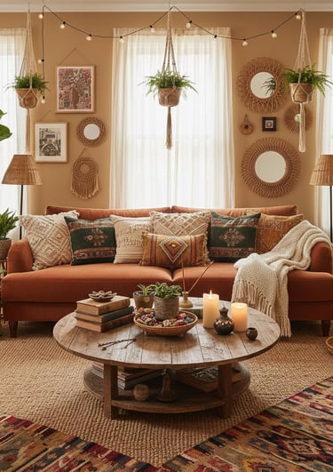 Boho living rooms celebrate creativity, comfort, and individuality. Layered textiles, earthy tones, and natural materials bring a relaxed and free-spirited feel to the space. Plants, handmade décor, and mixed patterns add character and warmth. This style is perfect for those who love a cozy, lived-in look with a touch of artistic charm.