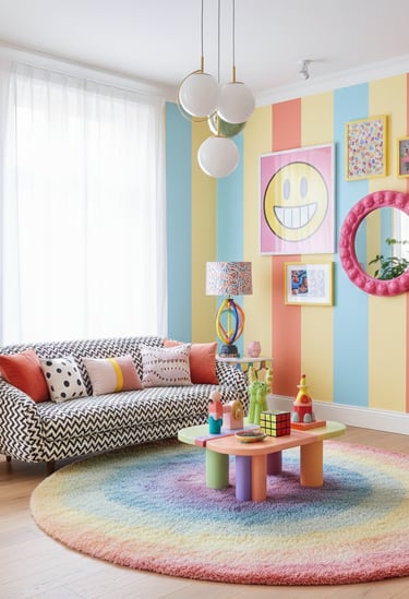 FunHaus is a bold and cheerful trend that blends graphic patterns, sculptural shapes, and whimsical elements to bring personality into the living room. Think striped features, unexpected décor pieces, and curated surprises that make the space feel energetic yet thoughtfully balanced. This aesthetic embraces playful contrasts without feeling cluttered, giving living rooms a joyful, expressive character.