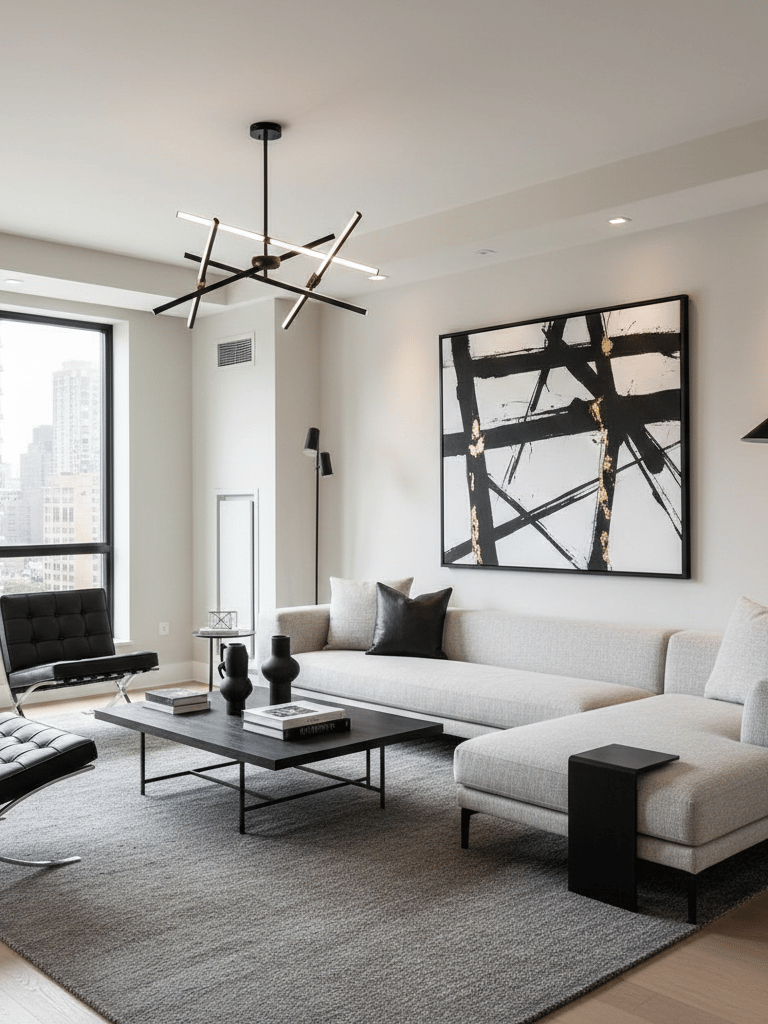 Keep the color palette neutral with hints of gold, brass, or matte black for a refined modern living room that feels elegant yet comfortable.