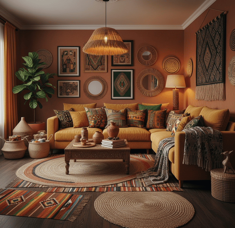 Afrohemian décor mixes boho’s relaxed layering with rich African textiles, handcrafted elements, and warm earthy tones. Pinterest reports a major surge in interest for African-inspired patterns, handwoven baskets, and artisanal wall art — creating spaces that feel vibrant, worldly, and deeply personal. Layer rugs, woven accents, and cultural textiles to bring this soulful, textured design to life.