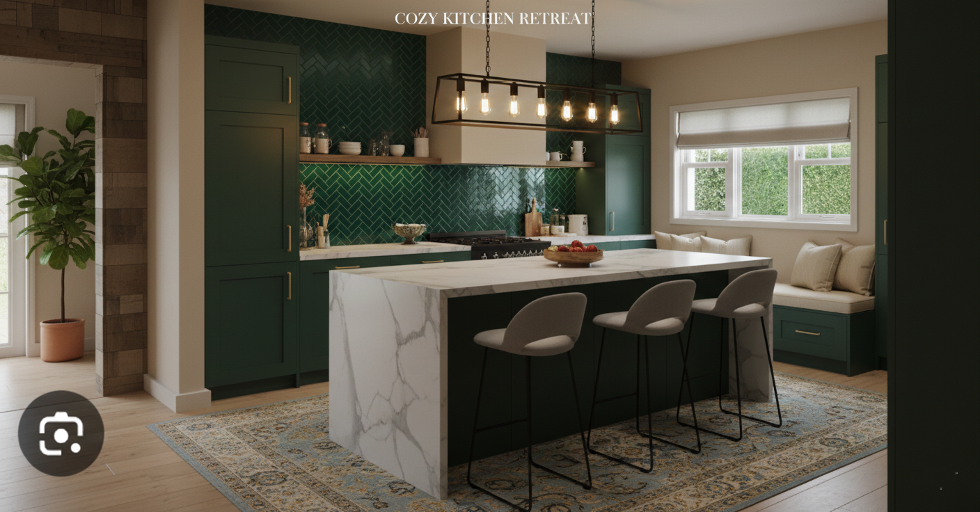 If space allows, create a cozy kitchen nook with a built-in bench and a small table. It’s perfect for intimate breakfasts, casual meals, or simply enjoying a cup of coffee.